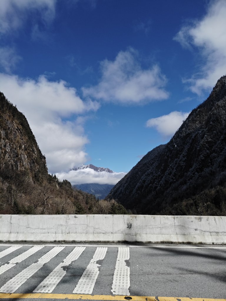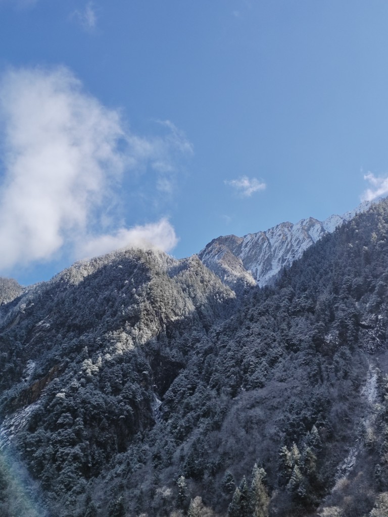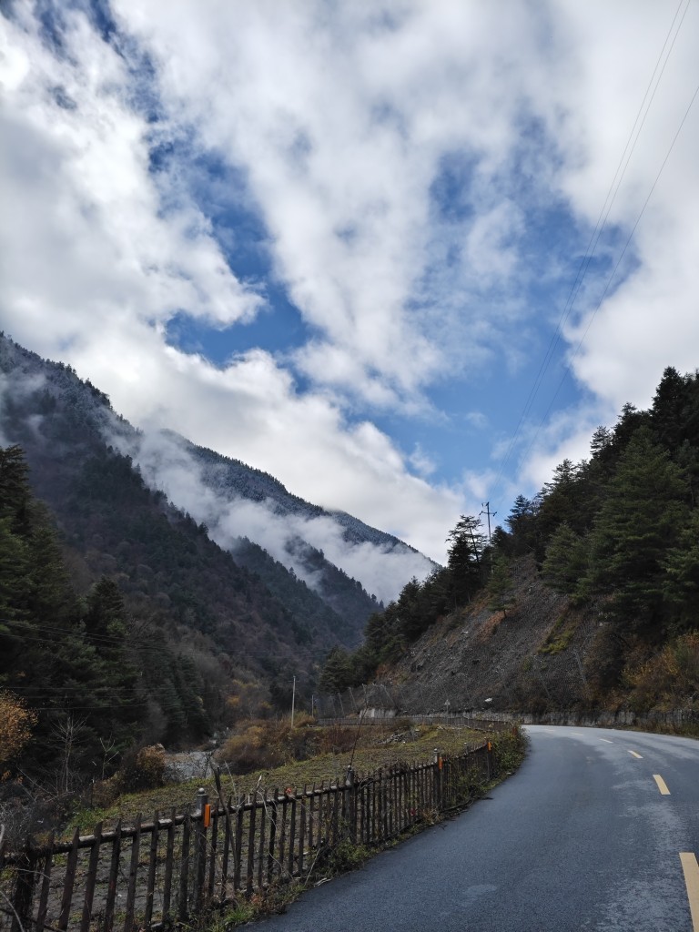 (有点怀疑会不会有太阳🌞),一直到中午11点,在一处山头转弯的地方,隔着很远就看到天空放晴的信号,云层里透出的是湛蓝的天空,还有阳光的朦胧。海拔高其实温度也比较冷,我和刘哥儿都迫切的希望阳光和温暖的到来。最后也如我们所愿